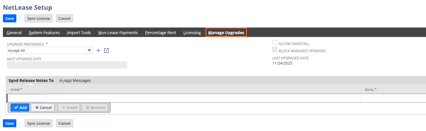 | Allow Uninstall | Check this box to permit the uninstallation of the NetLease Bundle—even if transactions have been posted using the bundle. | ✓ |