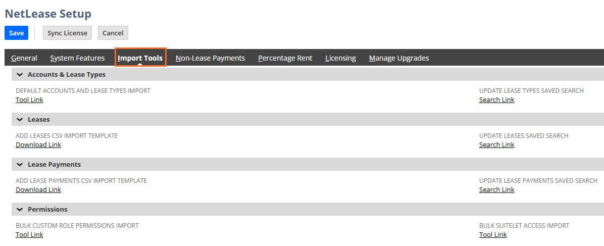 | Update Lease Payments Saved Search | Click the link to run a saved search for all lease payments, which can be downloaded as a CSV and re-imported to update existing lease payment records. |