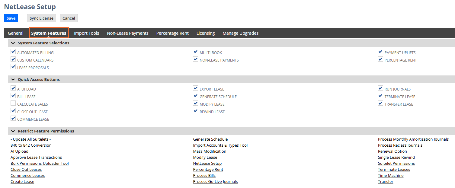 The System Features subtab allows users to enable NetLease functionalities, add quick access buttons, and manage Suitelet access. The features are detailed below: