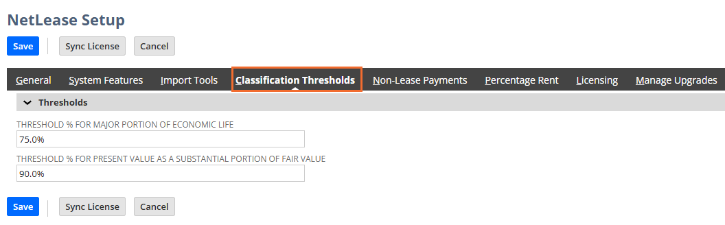This subtab is used to configure lease classification thresholds. These settings are available only when the Accounting Standard on the General subtab is set to ASC 842.