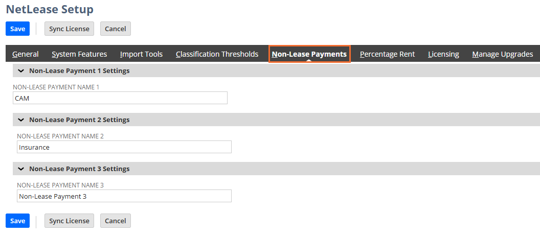Note: This section will only appear if Non-Lease Payments has been enabled in the System Features subtab.