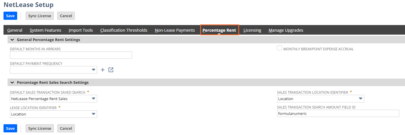 | Default Sales Transaction Saved Search | The default search used to identify sales for a given lease's location. The specific lease's location will be filtered for automatically. | NetLease Percentage Rent Sales |
