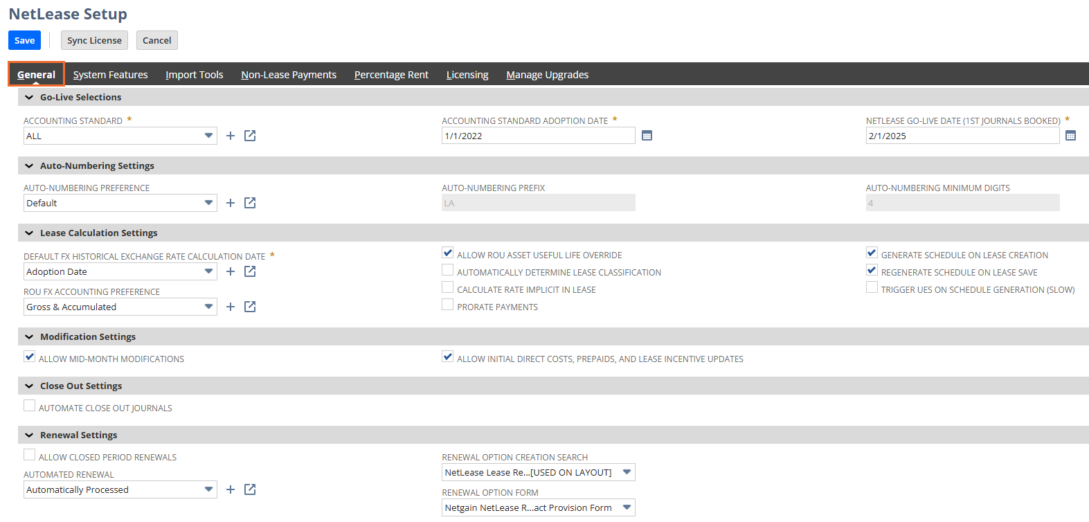 | Default Lease Transaction Booking Date | Yes | Specify the default date for booking all transactions created by NetLease. Selecting "From Lease" will set the transaction date according to the Lease Amortization Schedule, while "From Accounting Period" will set the transaction date based on the accounting period being processed. | From Lease Record |