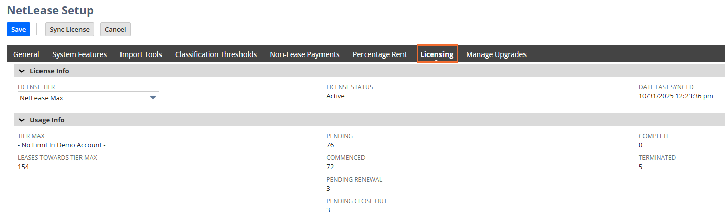 | License Tier | Identifies the NetLease product tier of the account. In Sandbox environments, this value can be modified. In Production environments, the value is fixed based on the purchased tier. | NetLease Max |