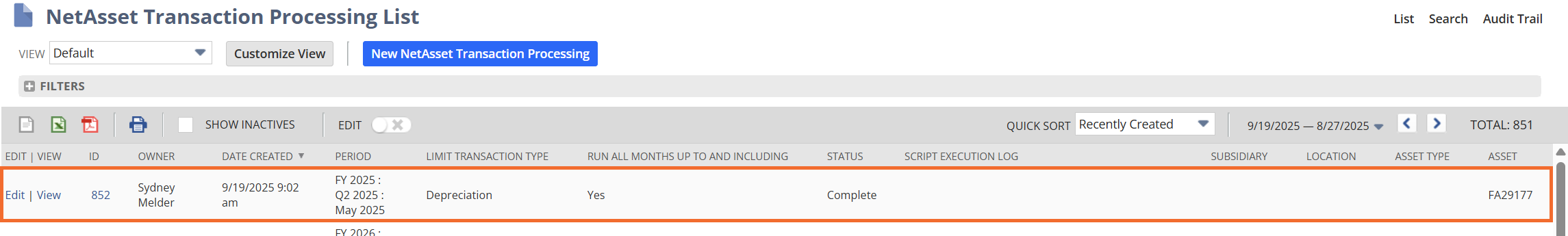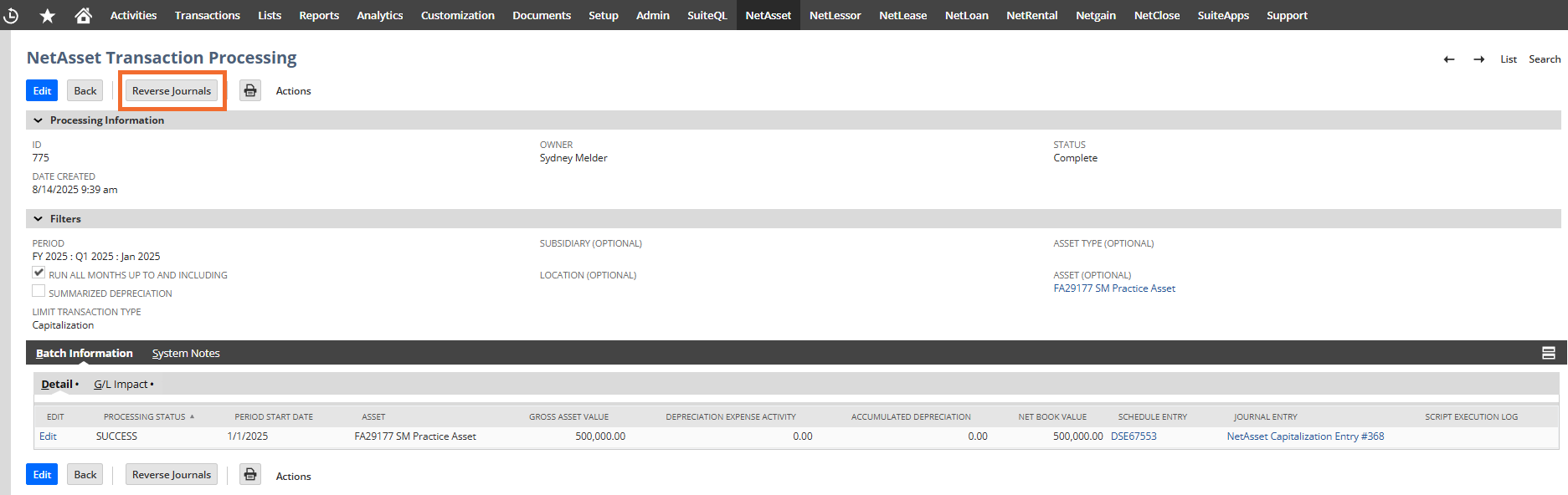 Note: If you get out of this screen before reversing the journals, you can navigate back to it via the following path: NetAsset > Process Monthly Journals > View Journal Processing History. Select View next to your desired batch.
