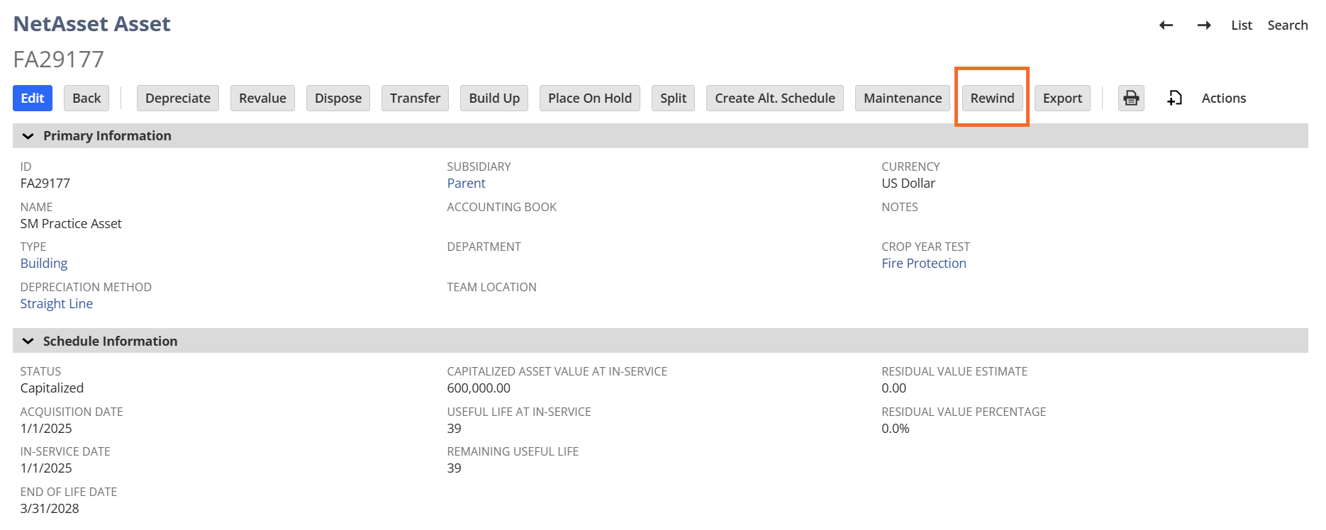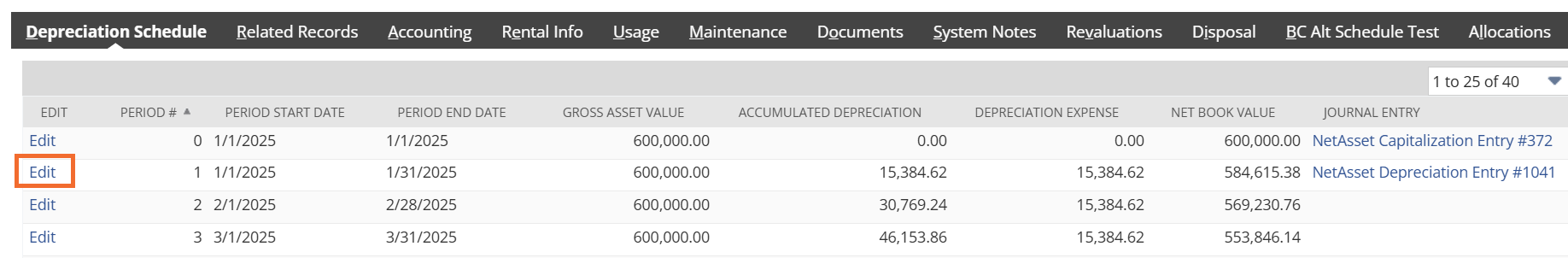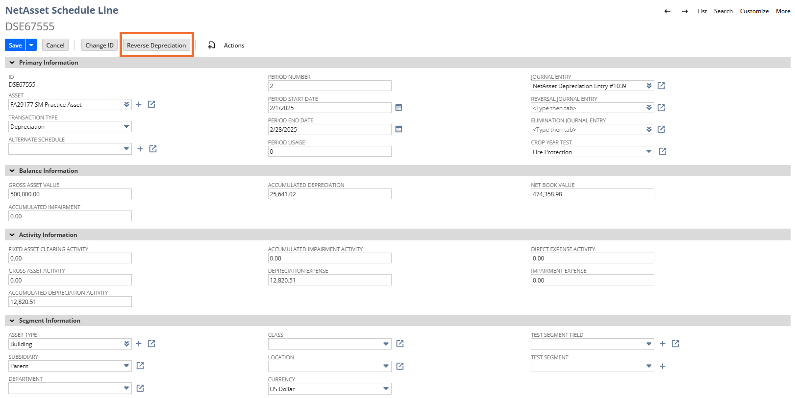 - Scroll down to the depreciation schedule and locate the specific schedule line with the entry you would like to reverse.