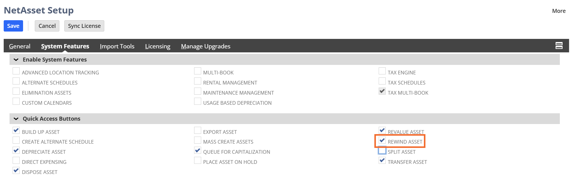 - You must have the Rewind button enabled. Navigate to NetAsset > NetAsset Setup > System Setup. Under System Features, ensure the Rewind Asset option is checked.