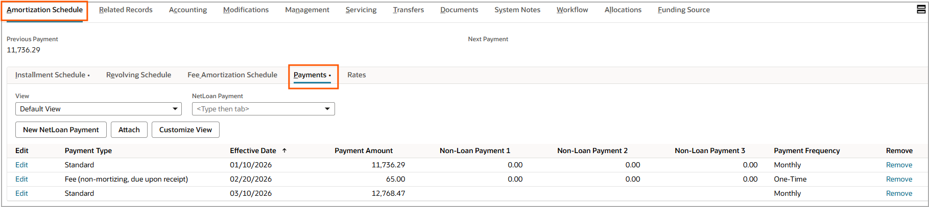 A NetLoan Payment Record is an entry on the payments sublist of the Amortization Schedule subtab on the loan record. It defines the terms of a recurring or one-time-payment - the payment type, amount, frequency, and effective date. It serves as the standing instruction that drives when and how Payment Requests are generated. Multiple payment records can exist on a single loan to reflect changes over time, such as an escalating payment schedule.
