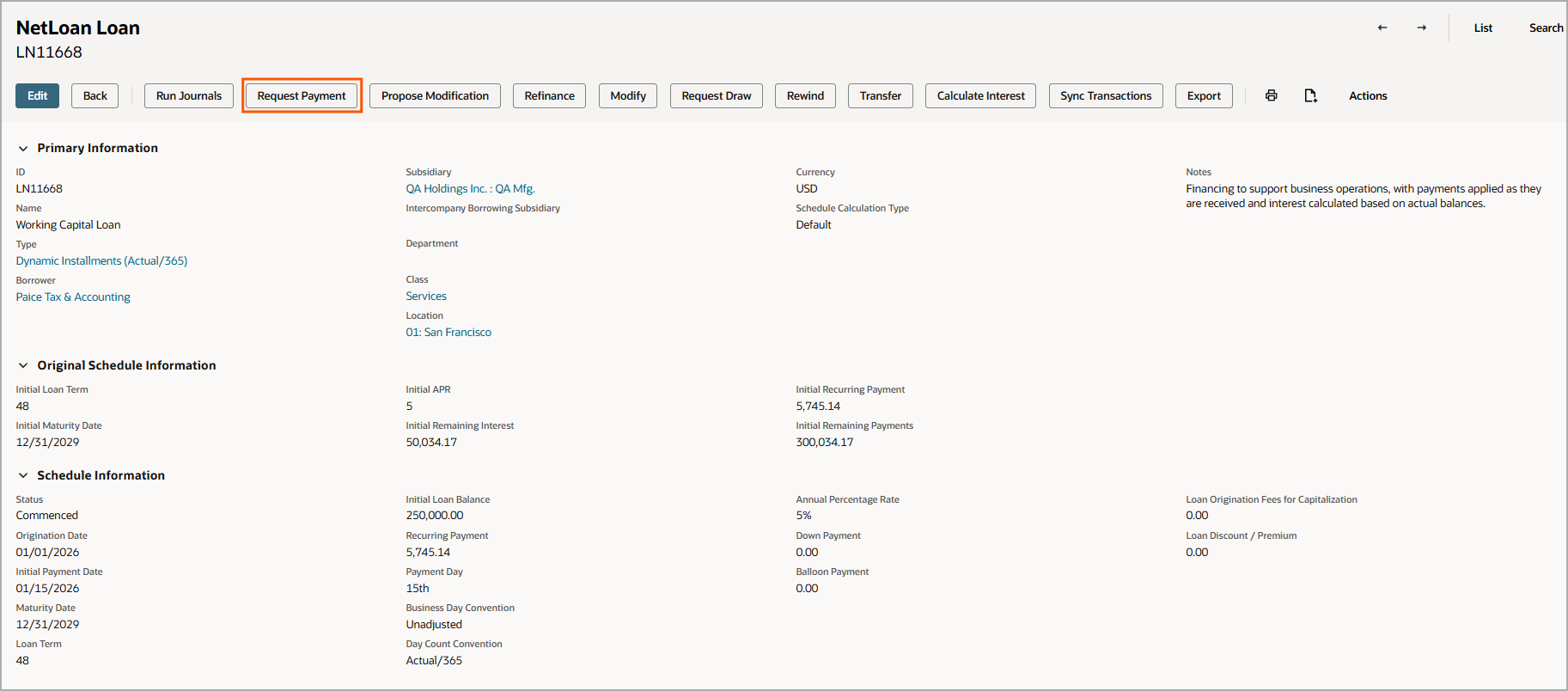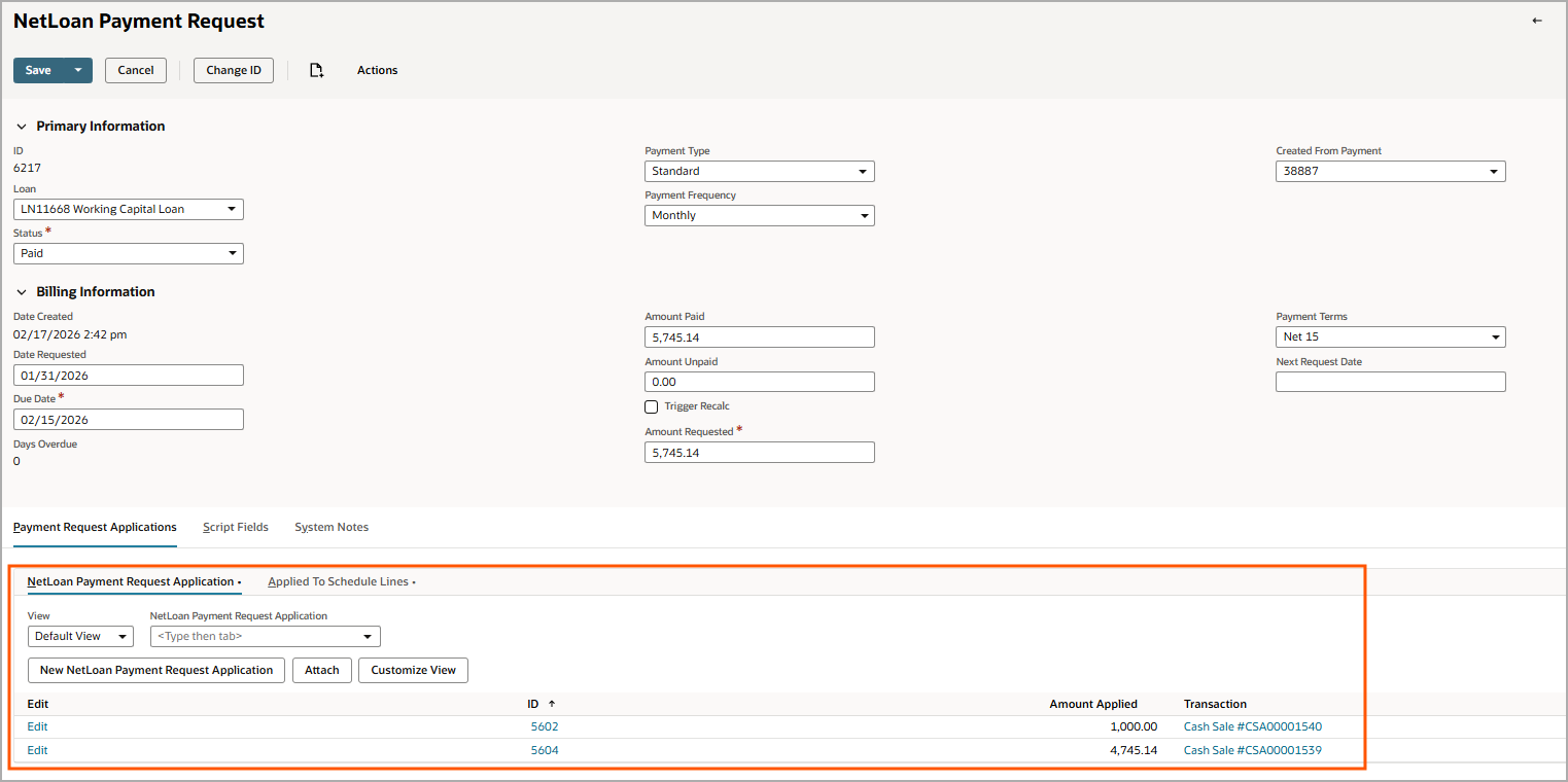 Payment Requests were introduced in NetLoan 2025.1.5.0 and do not apply to other loan types (Fixed Installment – Simple, Fixed Installment – Precision, or Revolving), which continue to use standard NetSuite invoices or bills.