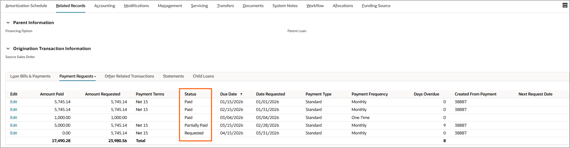 Applied payments appear as individual lines on the Payment Requests tab under Related Records on the loan record.
