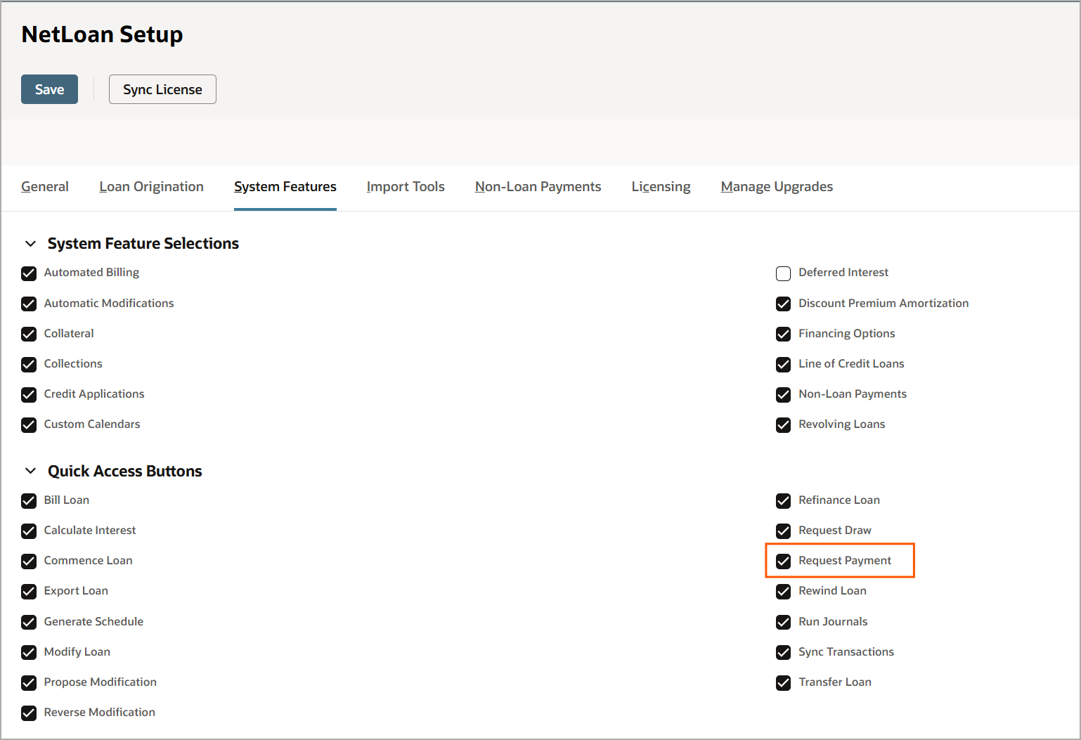 Note: If the Request Payment button is not visible on an eligible loan, verify that the Request Payment quick access button is enable in NetLoan System Setup (NetLoan > NetLoan Setup > System Setup > System Features tab > Quick Access Buttons section) and the user's role has the necessary permissions.