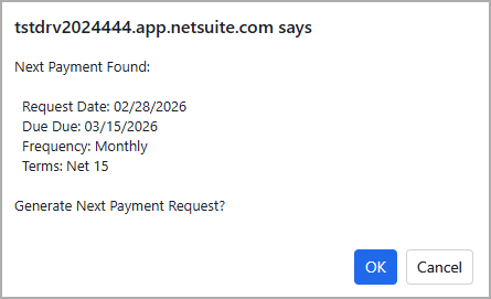Selecting it displays a confirmation dialog showing the upcoming Request Date, Due Date, Frequency, and Terms. Upon confirmation, the system generates the next Payment Request from the NetLoan Payment Record with the earliest pending Next Request Date.