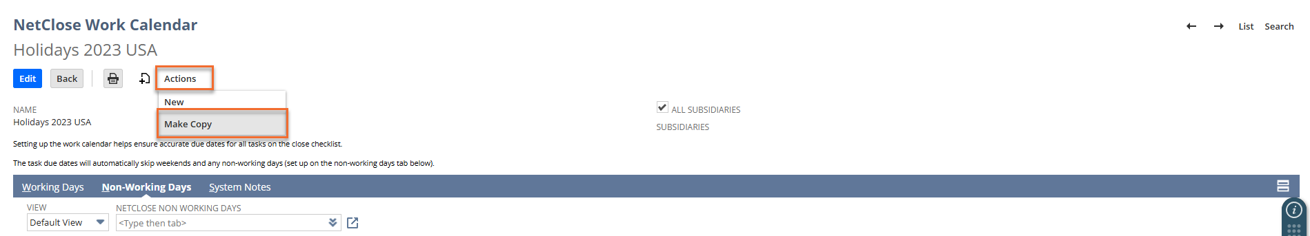 Out of the Box The work calendar "NetClose Template - All Subsidiaries" is included when the bundle is downloaded. This calendar sets all subsidiaries to a Monday - Friday work week. It does not include any holidays. This calendar can be left as is, edited, or deleted depending on your use case. |