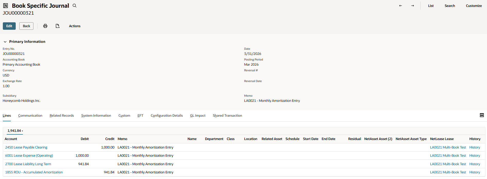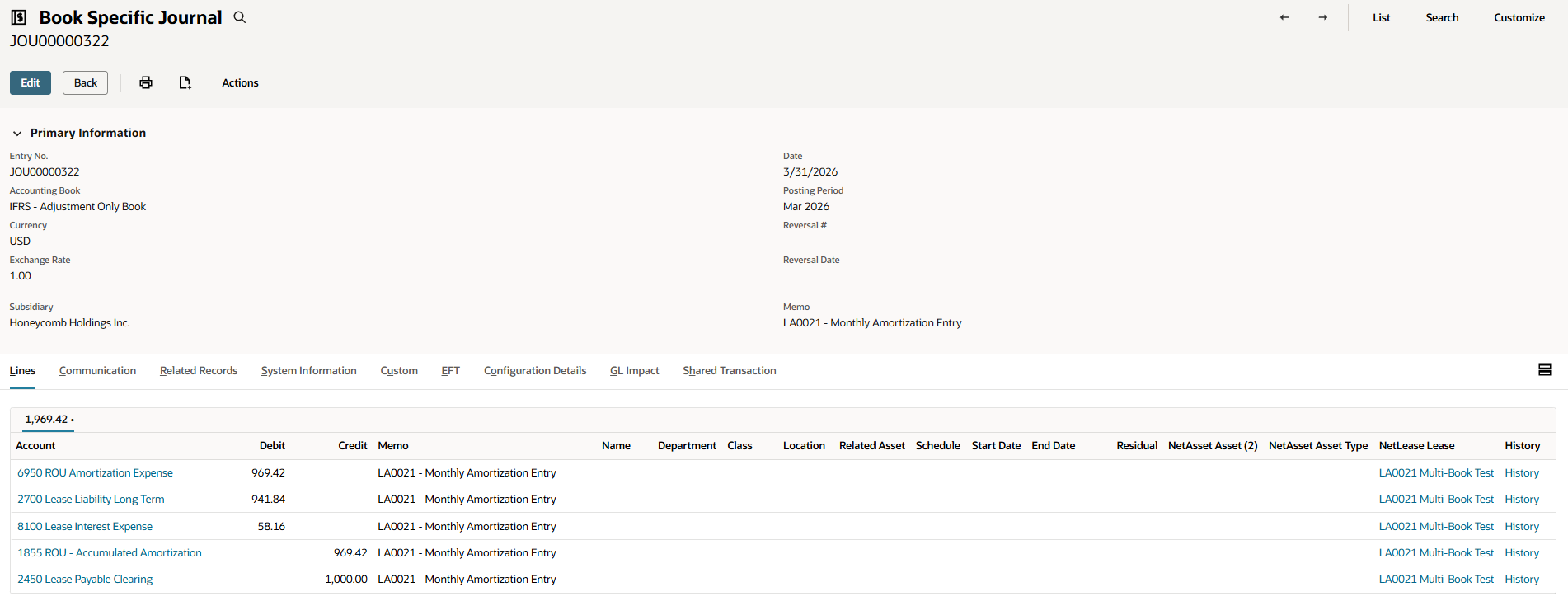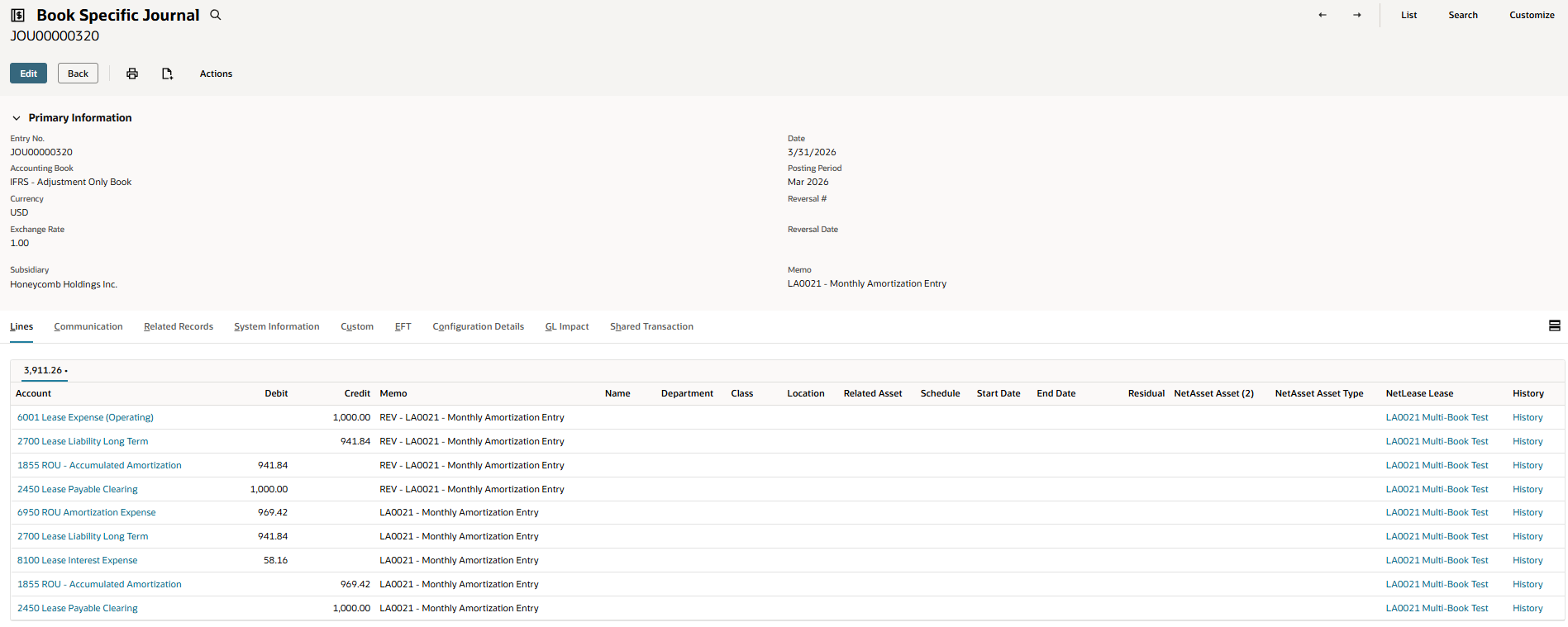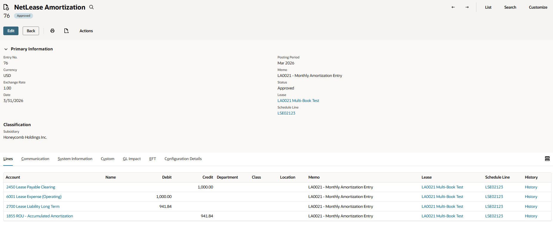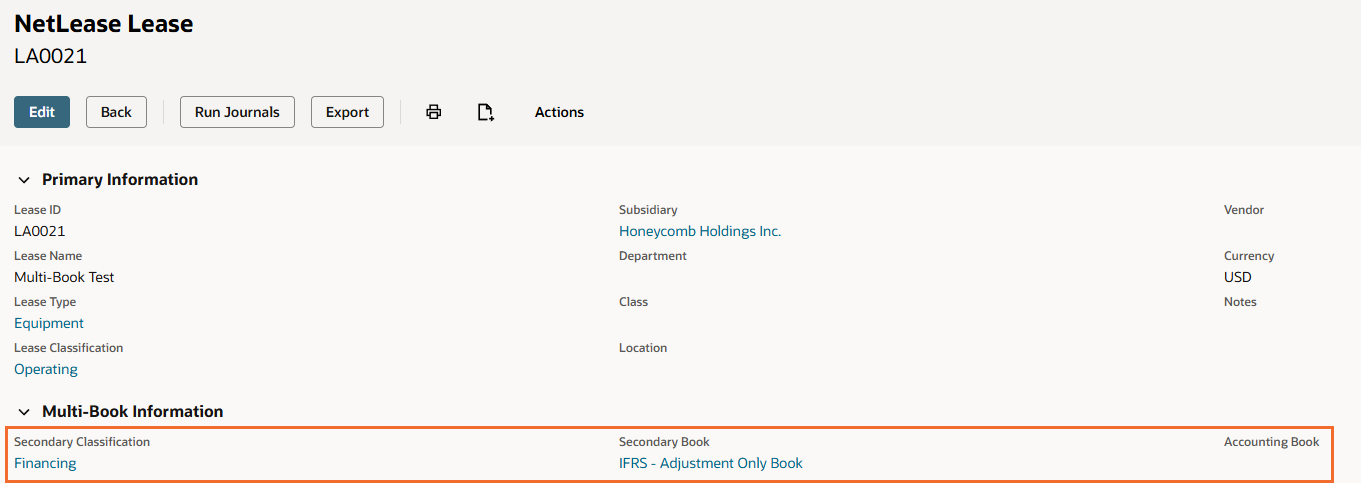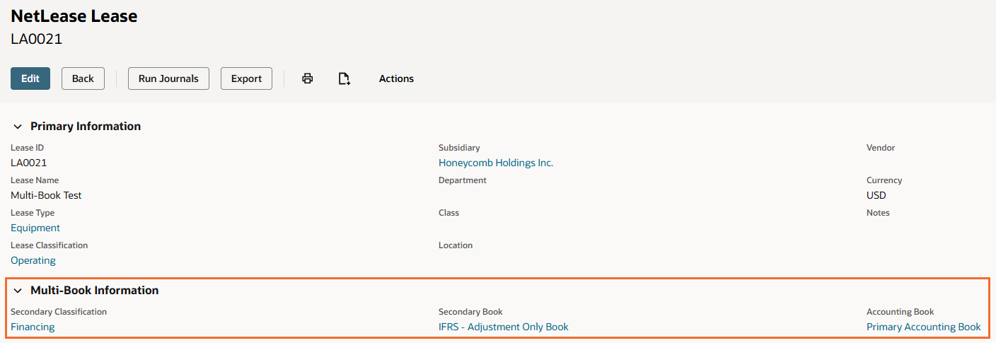 Regardless of which posting method is used, both journal entries created during processing will appear on the Multi-Classification Schedule subtab of the lease record. For Option 1, these will be the custom transaction and the book-specific journal. For Option 2, these will be the two book-specific journals — one for each book.