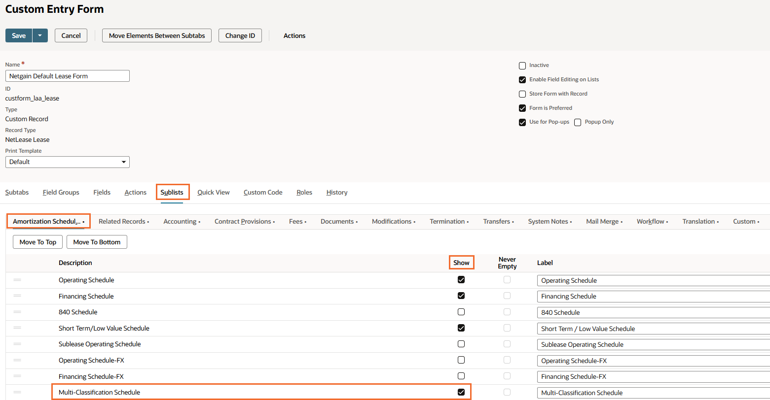 Note: If the Multi-Classification Schedule is not visible on the lease record, it must be shown on the custom form.