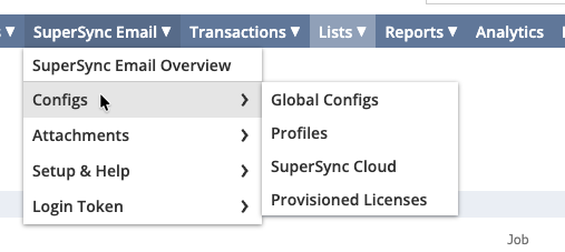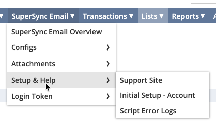 The SuperSync Email drop down appears in the NetSuite top navigation bar. It consolidates frequently accessed SuperSync Email pages into a single menu to reduce navigation time and improve usability.