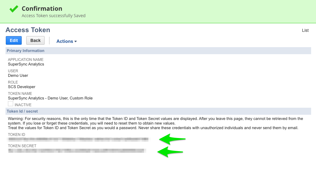 Upon saving, NetSuite will display the Token ID and Token Secret.