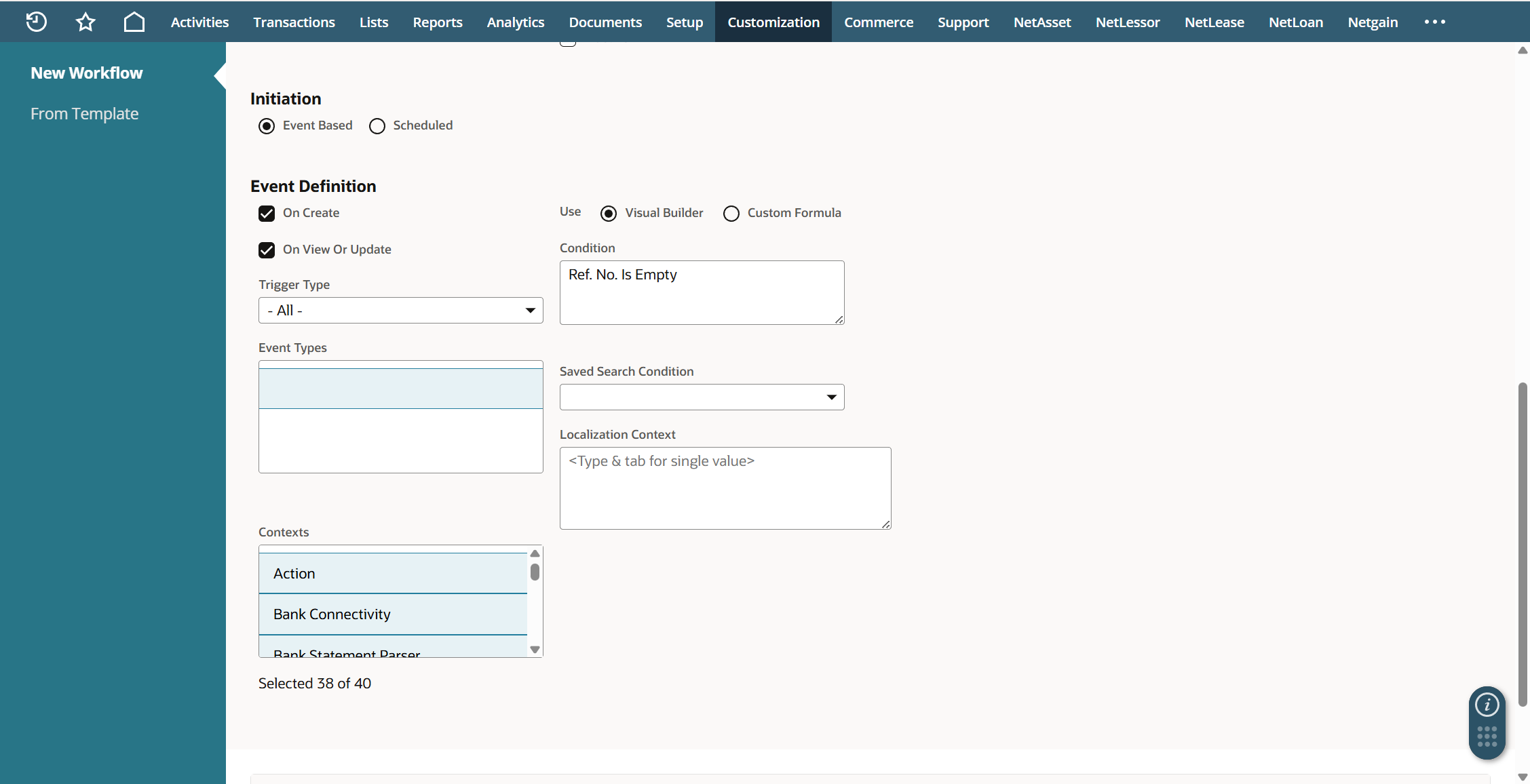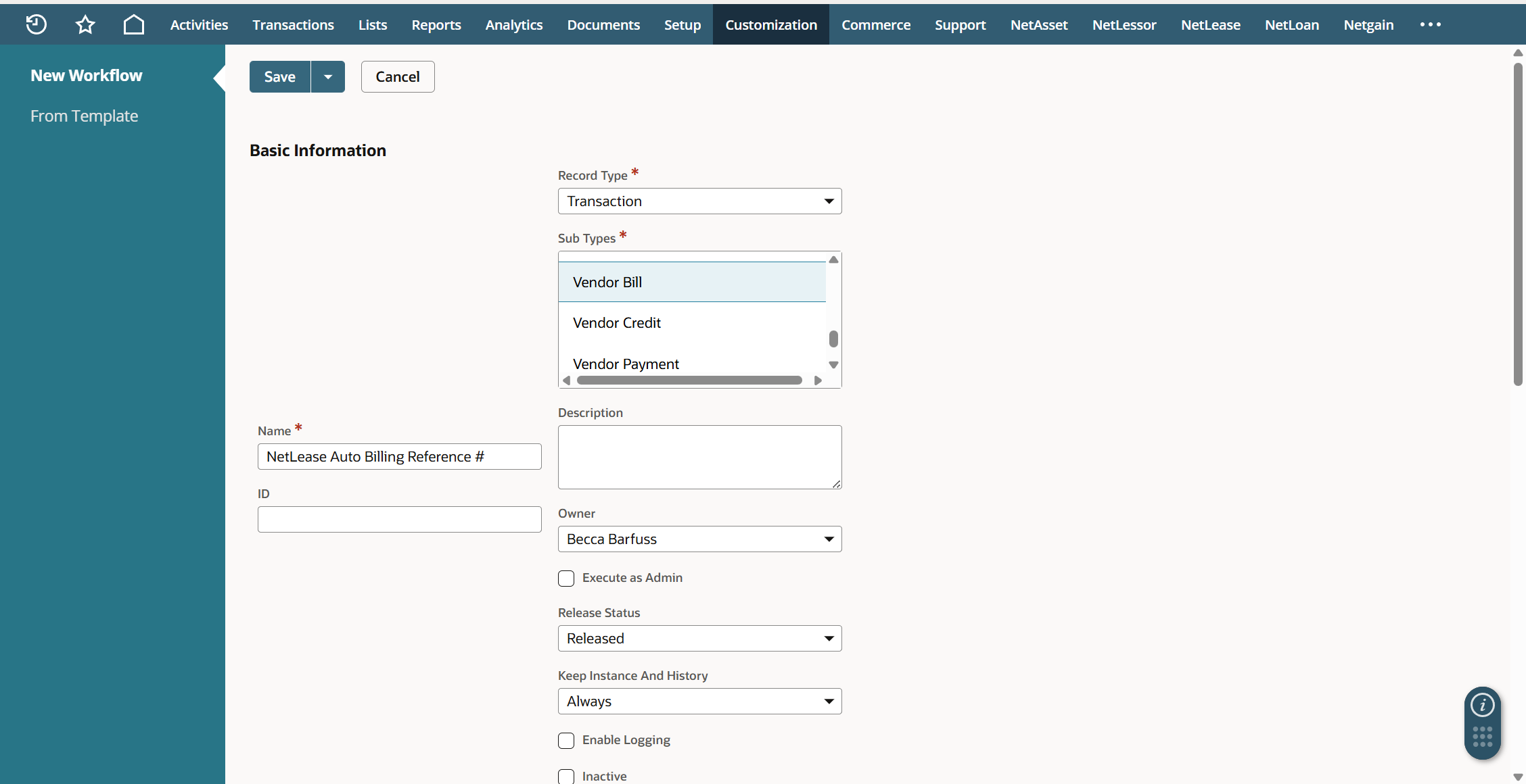 While workflows are a native NetSuite feature and are not maintained by Netgain, they can be setup to work on our records since we are a fully embedded app in NetSuite. In order to follow the steps below, your role will need the ability to create workflows in NetSuite.