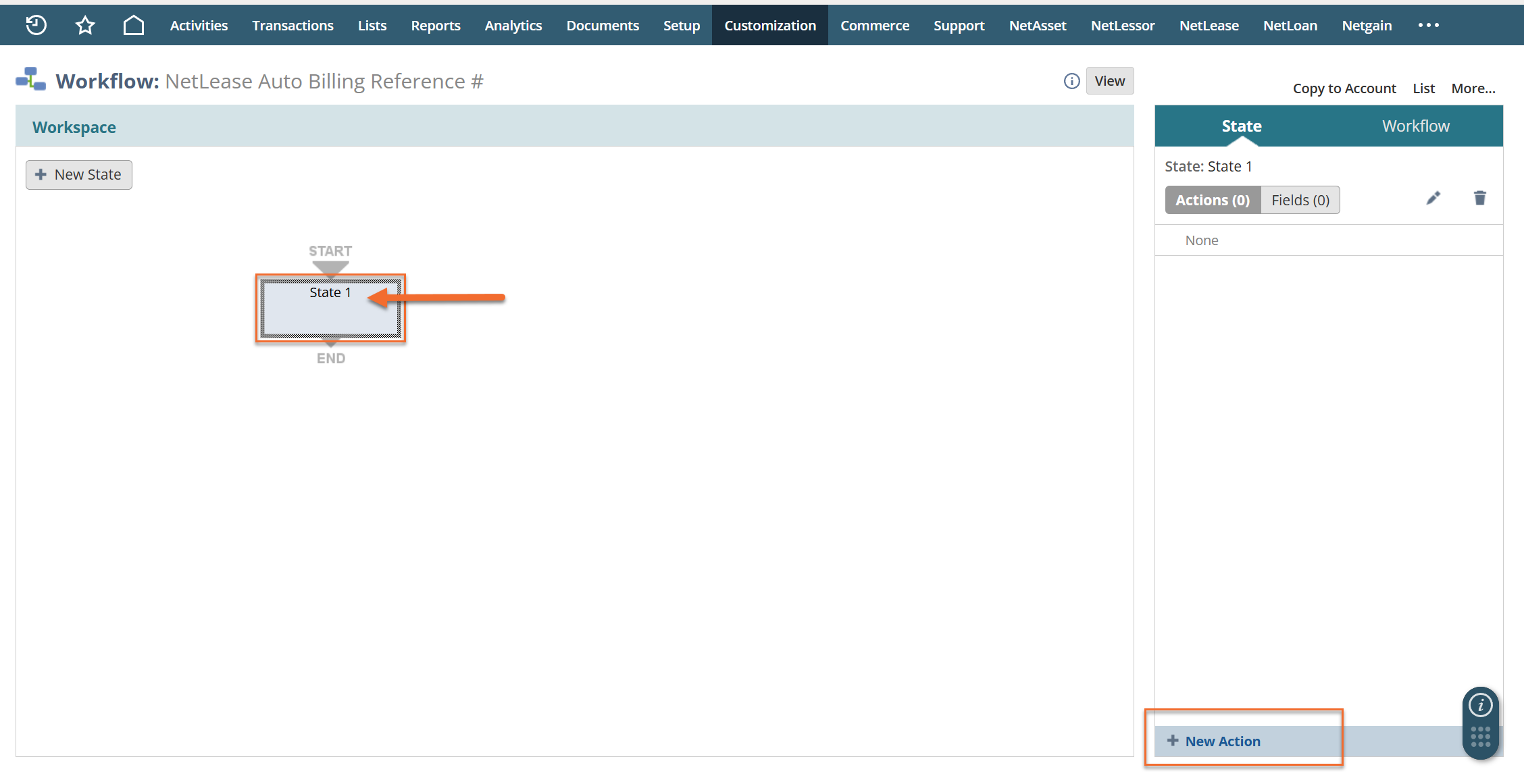 - Click anywhere in the "State 1" box on the screen. This will pull up the sidebar for the state. Click the "New Action" button at the bottom of the sidebar.