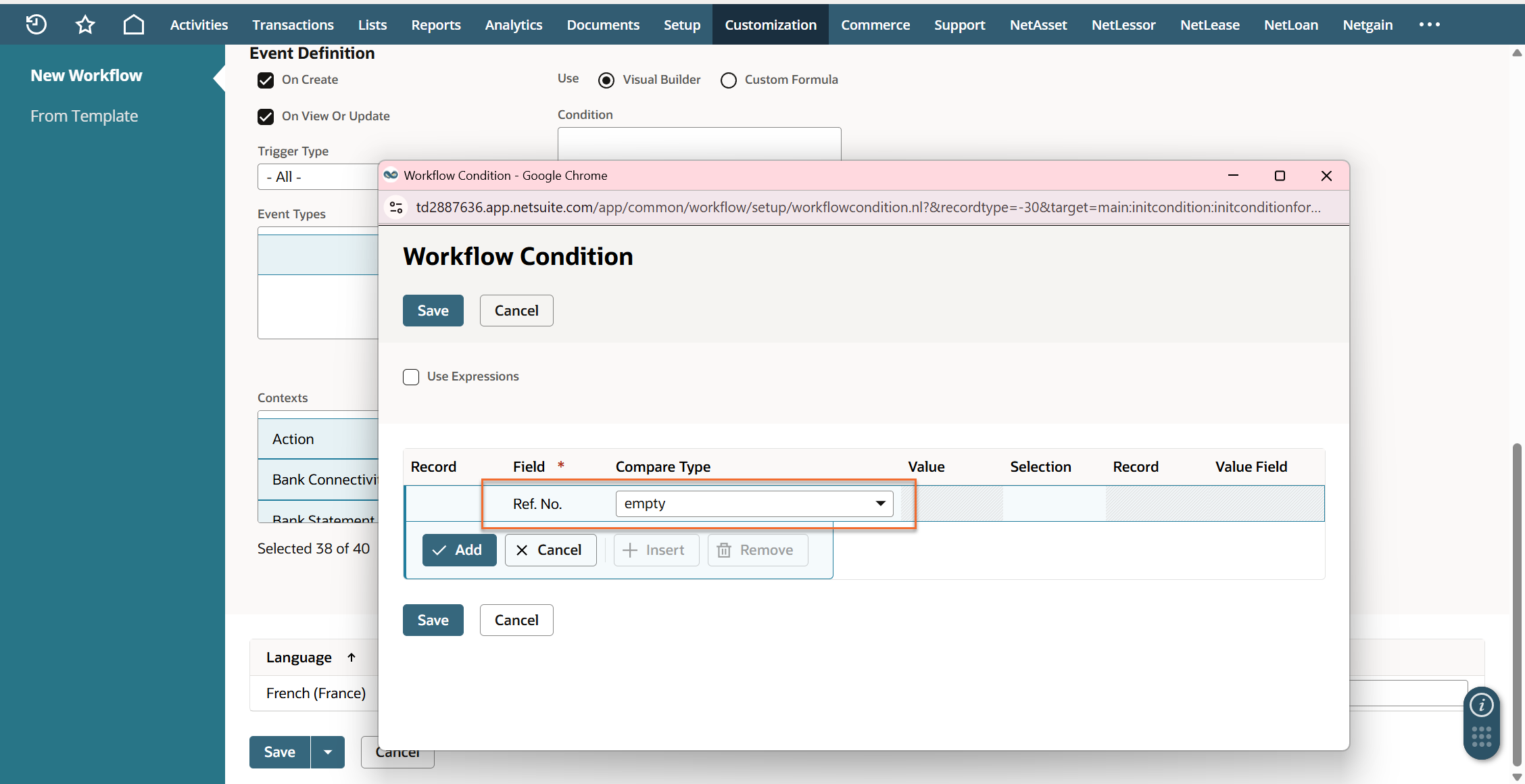 - Scroll down to the second half of the page to the Initiation section. Open the Condition field and set the Field to "Ref. No" and Compare Type to "empty". Click Save.