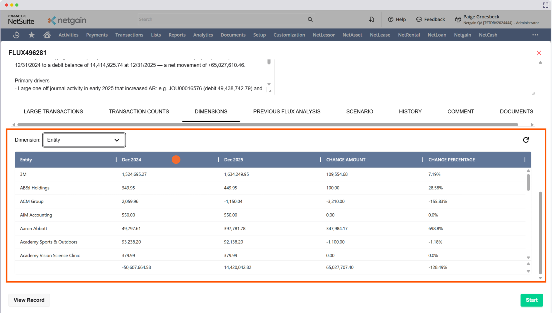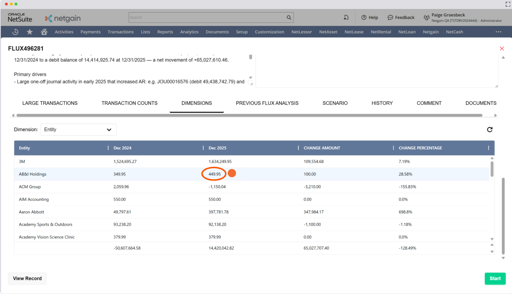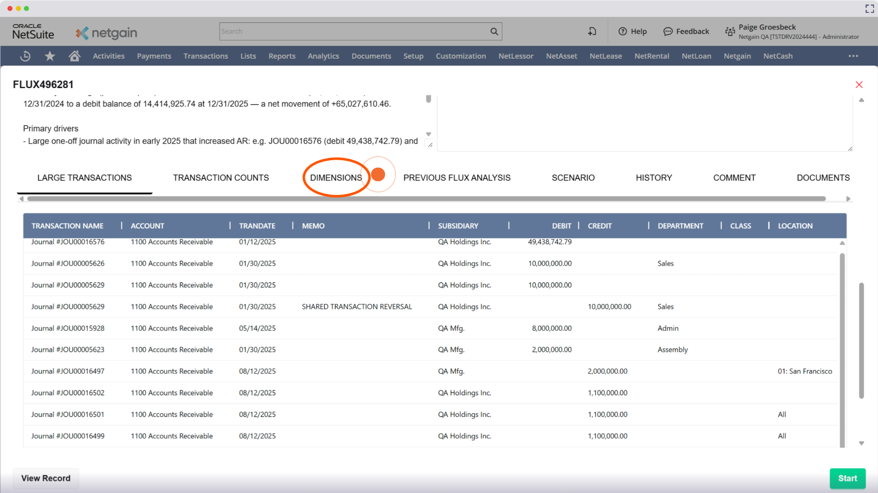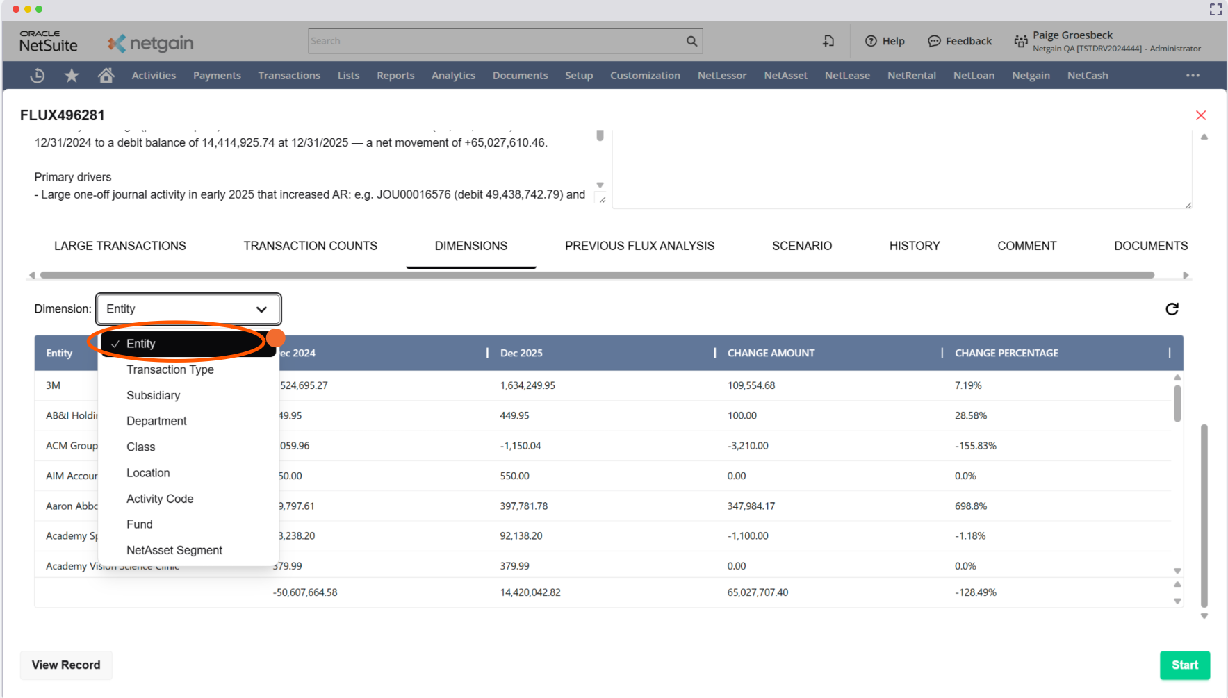 Flux Analysis Dimensions lets you review account variances across multiple business dimensions—like Entity, Transaction Type, Subsidiary, Department, Class, Location, and custom segments—without creating separate flux scenarios for each view.