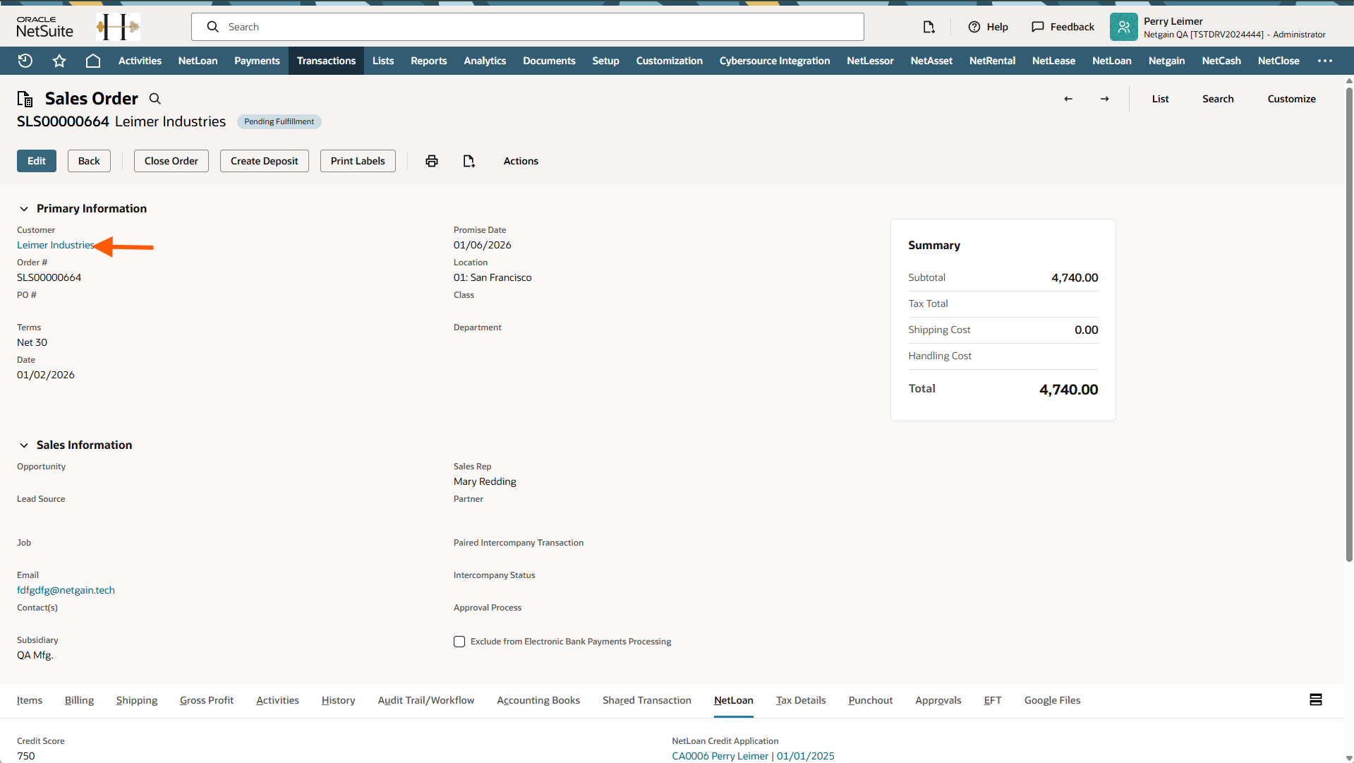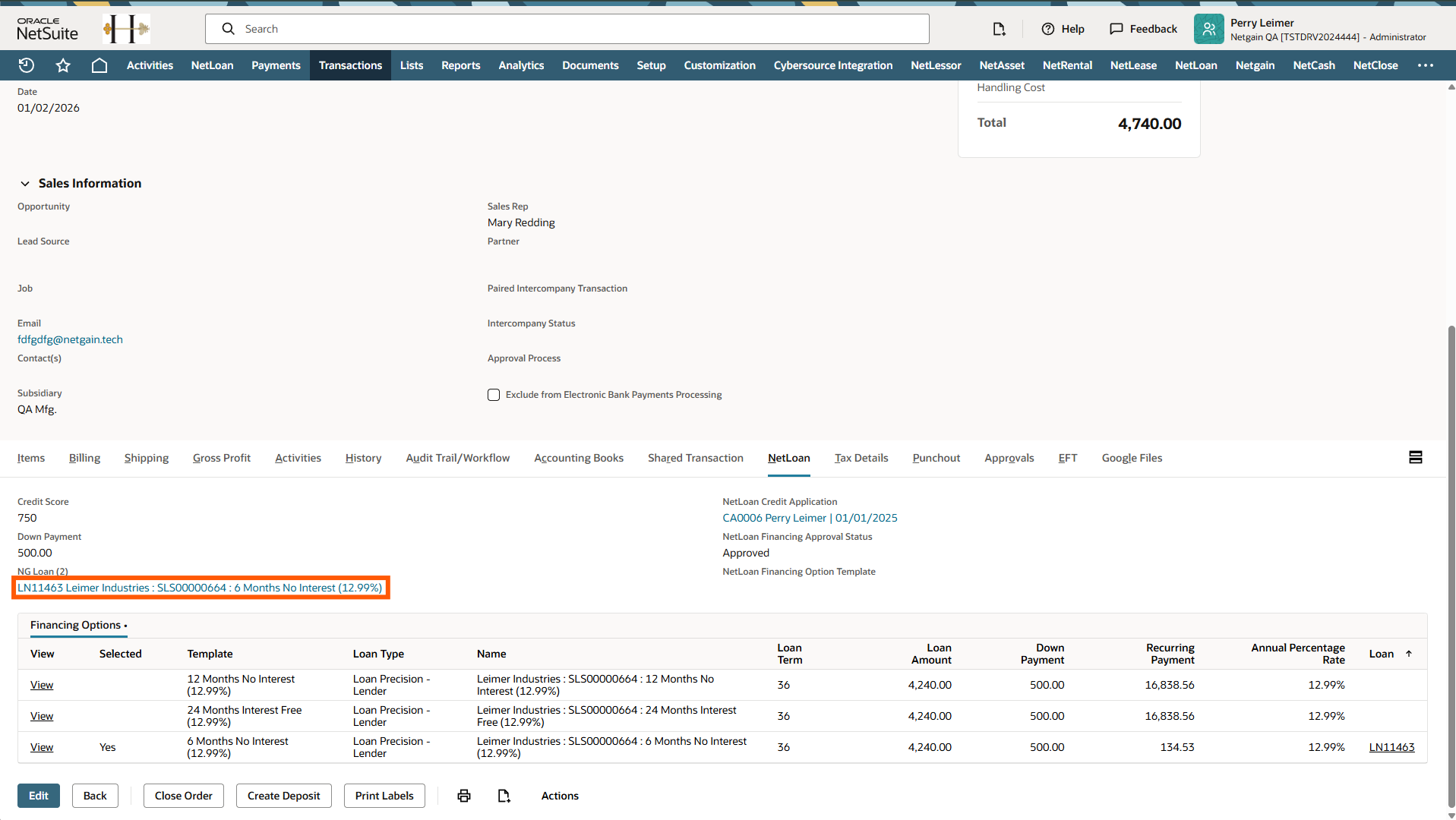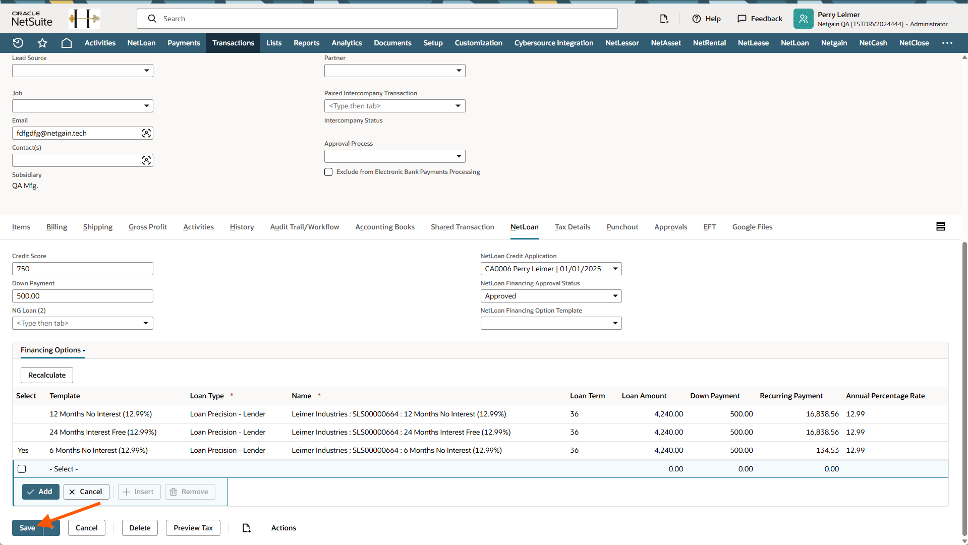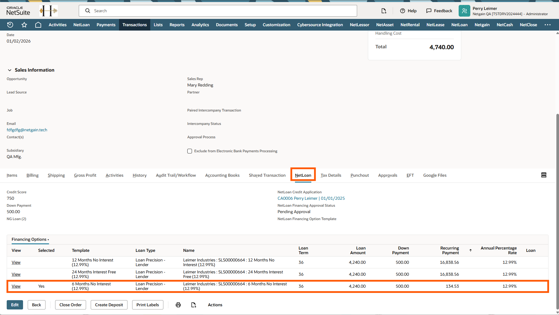 When a NetLoan Financing Option is selected on a Sales Order in NetSuite, a user with the proper permissions will need to review the financing option and approve it for a loan to be created.