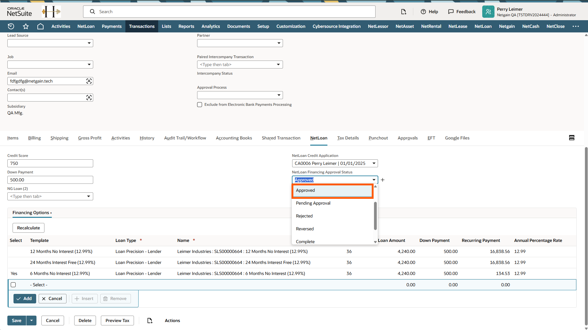 - Set the "NetLoan Financing Option Approval Status to "Approved" to have the system create a loan.