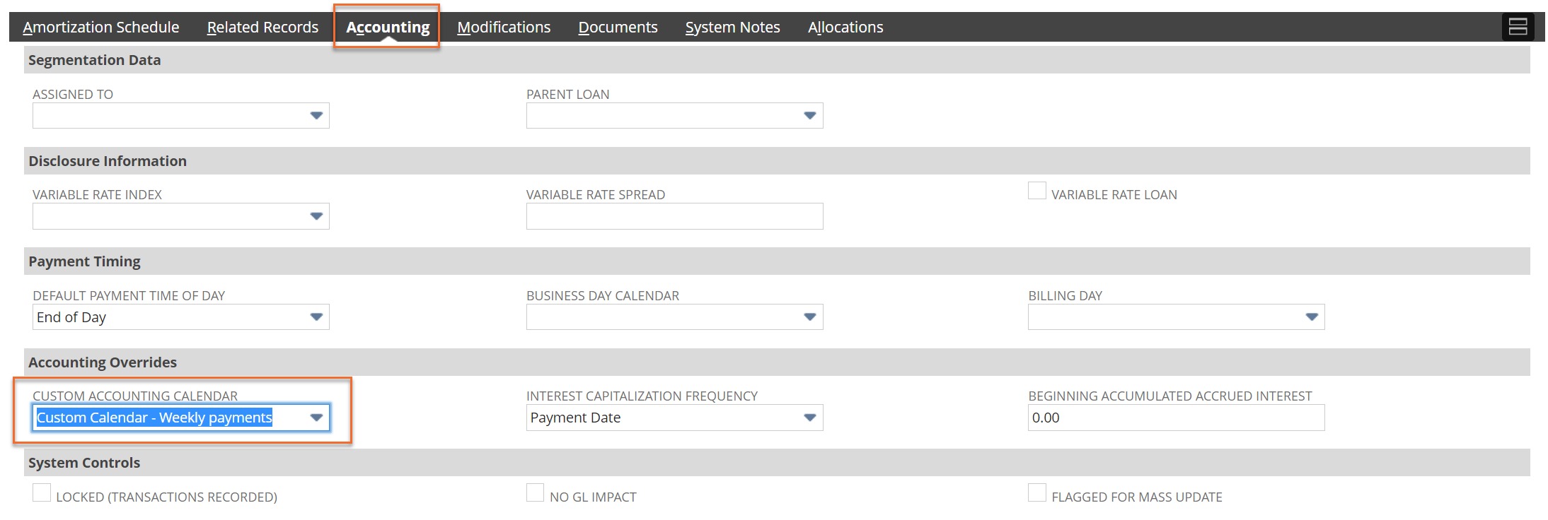 - Alternatively, custom calendars can be added directly to a loan record. To do so, the loan record will need to be in the "Pending" status. Navigate to the loan record you wish to edit and select the calendar you created in the Custom Accounting Calendar field on the Accounting Subtab.
