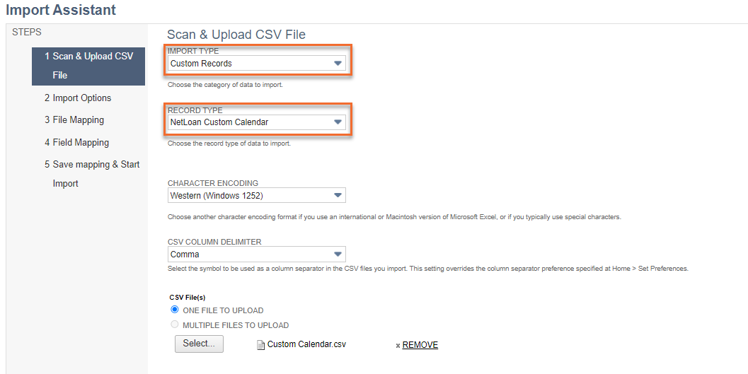 - To upload the Custom Calendar file, navigate to Setup > Import/Export > Import CSV Records. Designate the Import Type as Custom Record and NetLoan Custom Calendar as the Record Type: