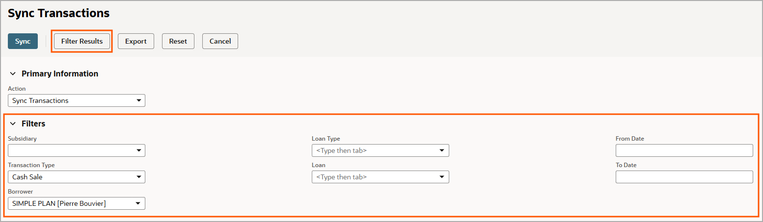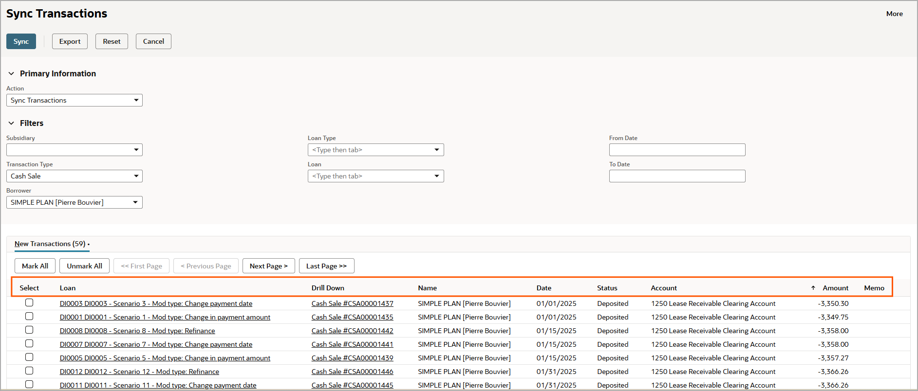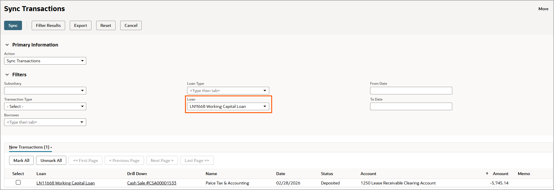 - The Sync Transactions page displays available transactions. By default, only transaction lines tagged to the loan on the line level appear.