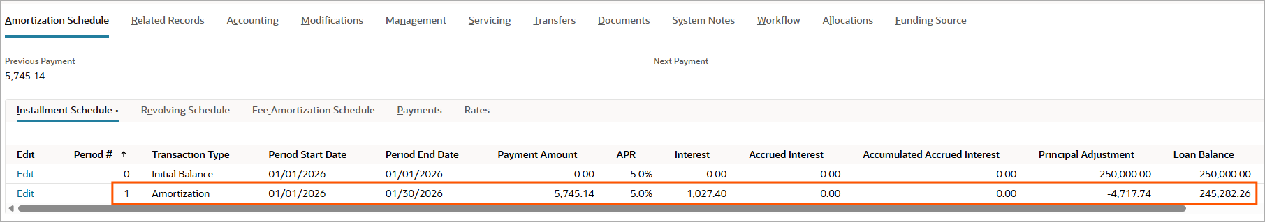 The system creates new schedule lines on each affected loan showing the payment application toward interest and principal.