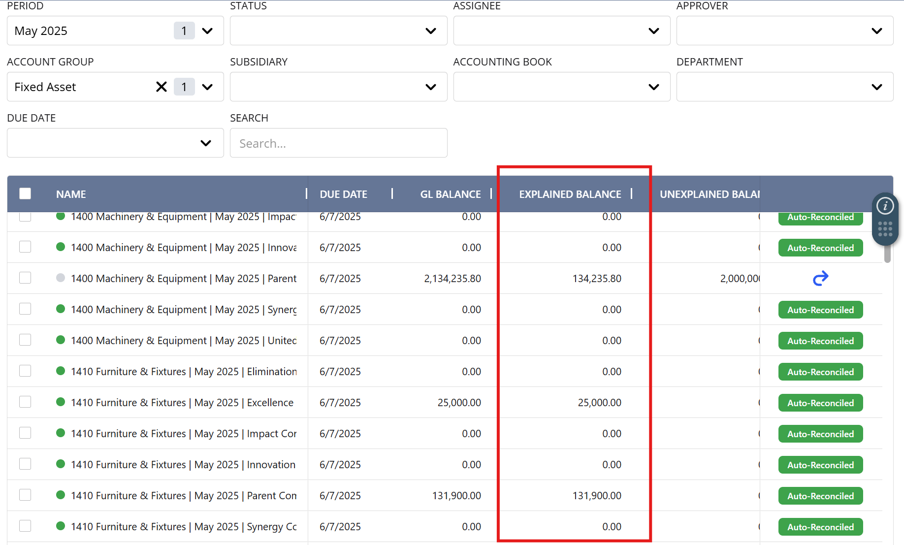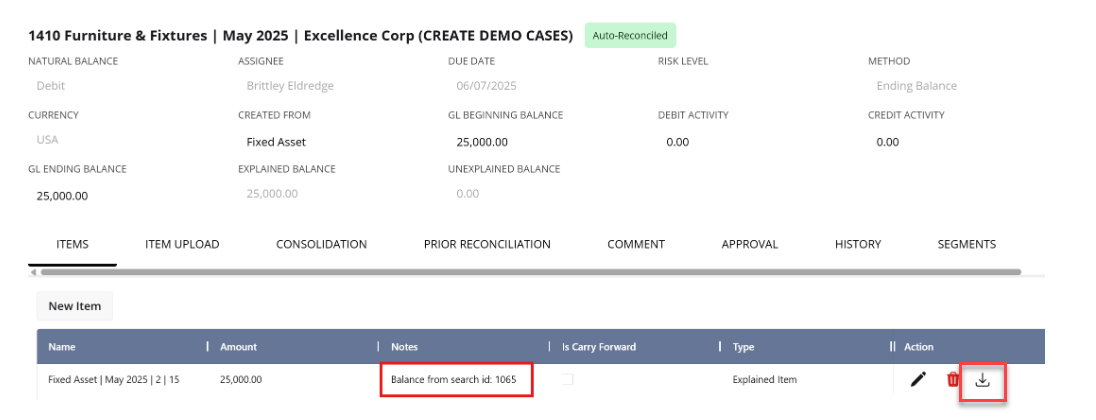 After the groupings have finished generating, go to NetClose > Reconciliations > Prepare Reconciliations and filter for the groupings you generated. You should see the "Explained Balance" is auto-filled by the saved search results. Click on a reconciliation to see the item. You may download the search results via the download icon on the item line.