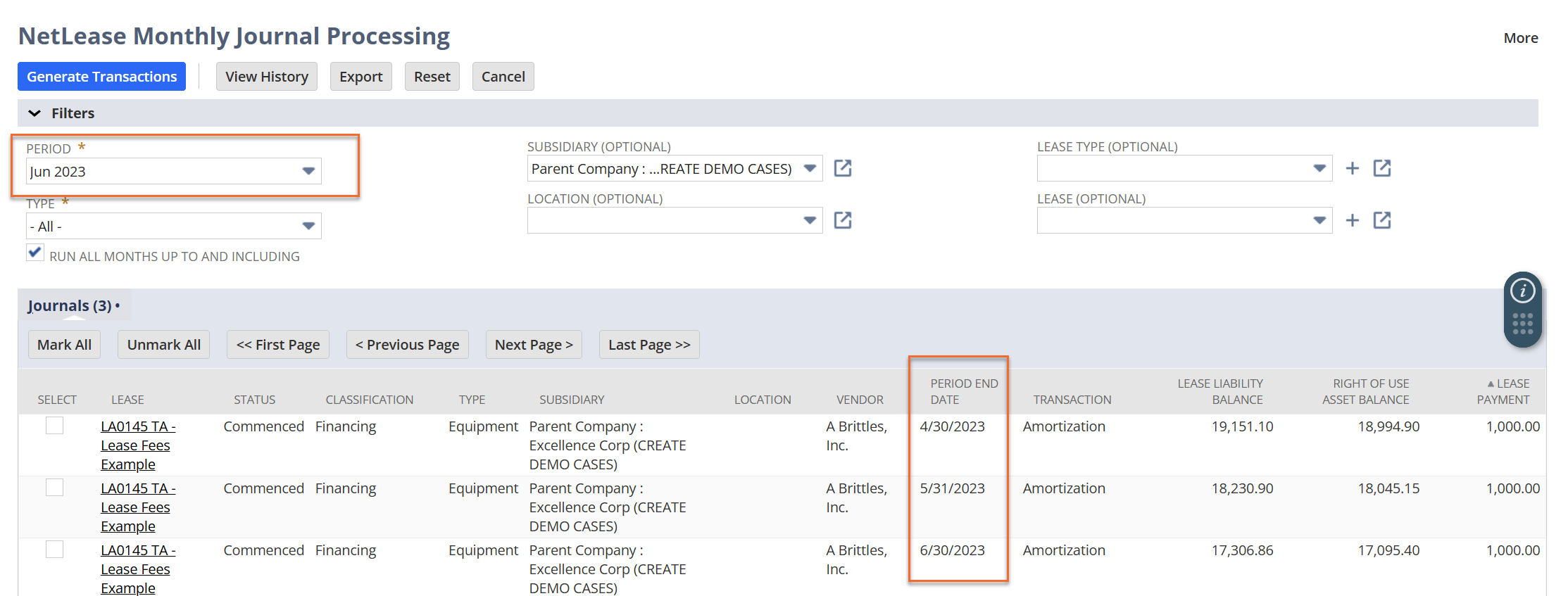 - Initial balance entries use the lease commencement date as the transaction date.