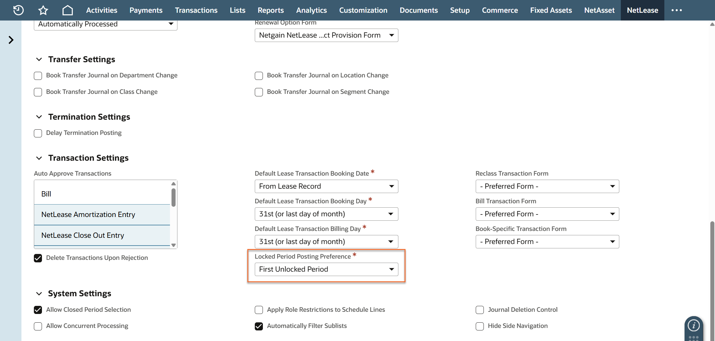 When the period is Locked, the system will look at the NetLease system setup option called "Locked Period Posting Preference".